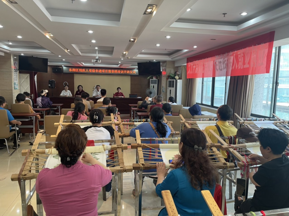 豫章绣技艺是江西省级非物质文化遗产的重要组成部分,蕴含着独特的刺绣文化内涵和艺术价值。为弘扬中华优秀传统文化,让非遗融入生活,4月28日下午,东湖区残联省级非遗项目“豫章绣”培训班在区残疾人之家开班,来自全区的20名残疾学员参加培训。